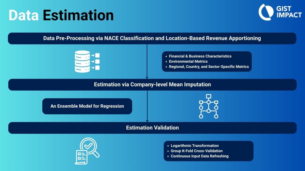 ML Estimation is the process of using verified data patterns to predict missing metrics;Â allowing us to move away from working with incomplete information and toward a scientific approach where every estimated value is grounded in real-world operational and environmental correlations. At GIST Impact, we integrate a broad spectrum of inputs ranging from financial and business characteristics to environmental and sector-specific metrics to address data gaps. These are further supported by country and region-specific insights.