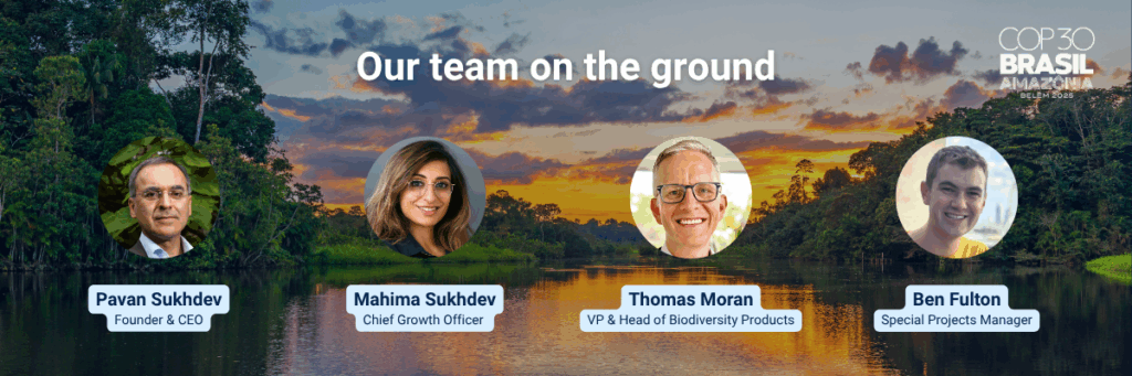 Our team – CEO Pavan Sukhdev, Chief Growth Officer Mahima Sukhdev, VP & Head of Nature and Biodiversity Products Thomas Moran, and Special Projects Manager Ben Fulton – will be engaging across key discussions on impact data, nature, and sustainable finance.