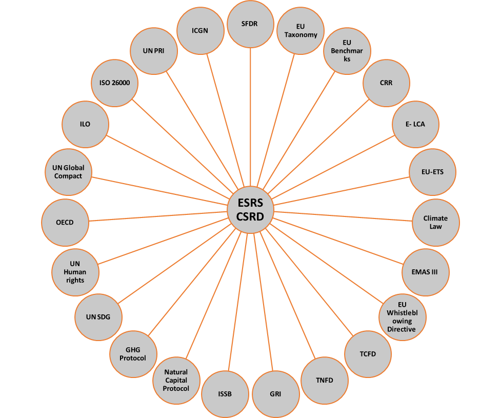 Going even further, the explanatory note of draft ESRS reflects around 23 separate initiatives, legislations and frameworks that are linked through the ESRS disclosure requirements. These include: