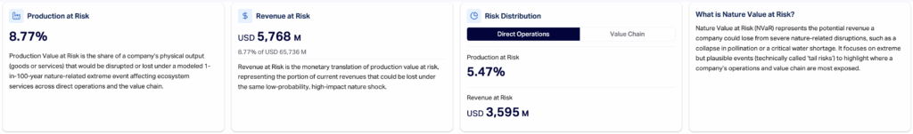 The core NVaR metric represents the share of production that could be disrupted under severe ecosystem degradation scenarios. This production-loss fraction can be translated into financial terms – such as revenue at risk – allowing nature exposure to be analysed alongside other financial risk indicators.