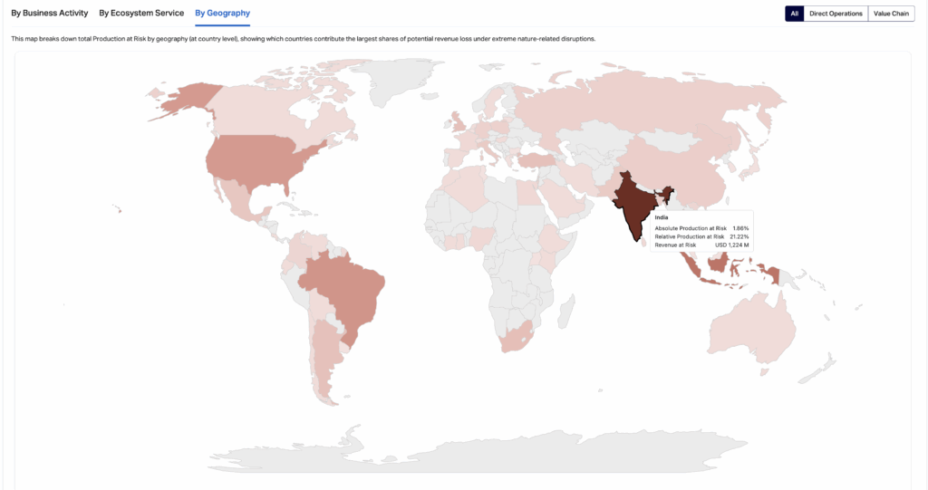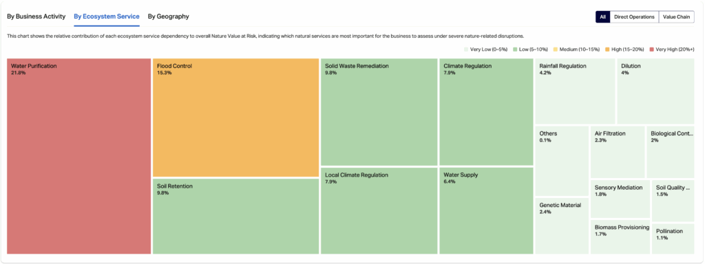 Nature Value at Risk distinguishes between these channels, helping organisations understand whether exposure is concentrated in their own operations or transmitted through sourcing networks.