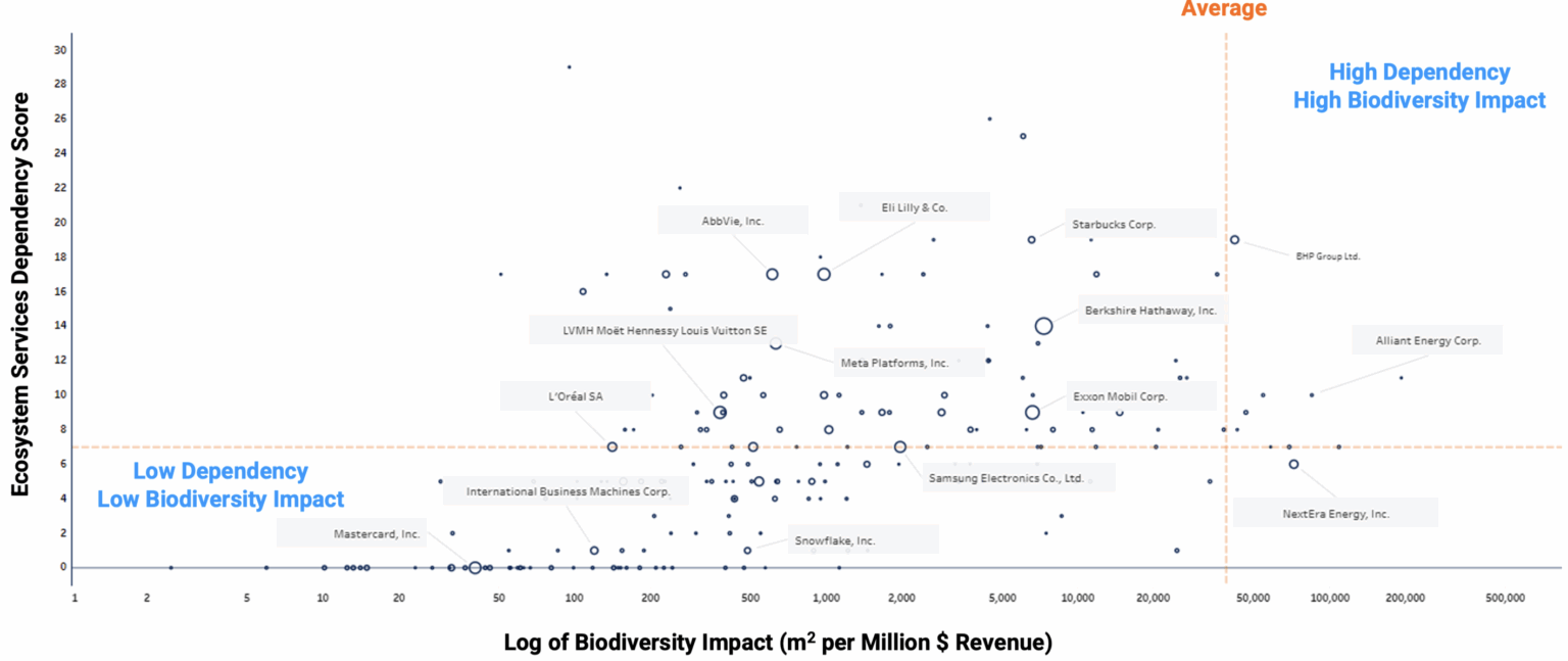 - Y-axis: Dependency levels, showing which companies heavily rely on ecosystem services under stress or depletion